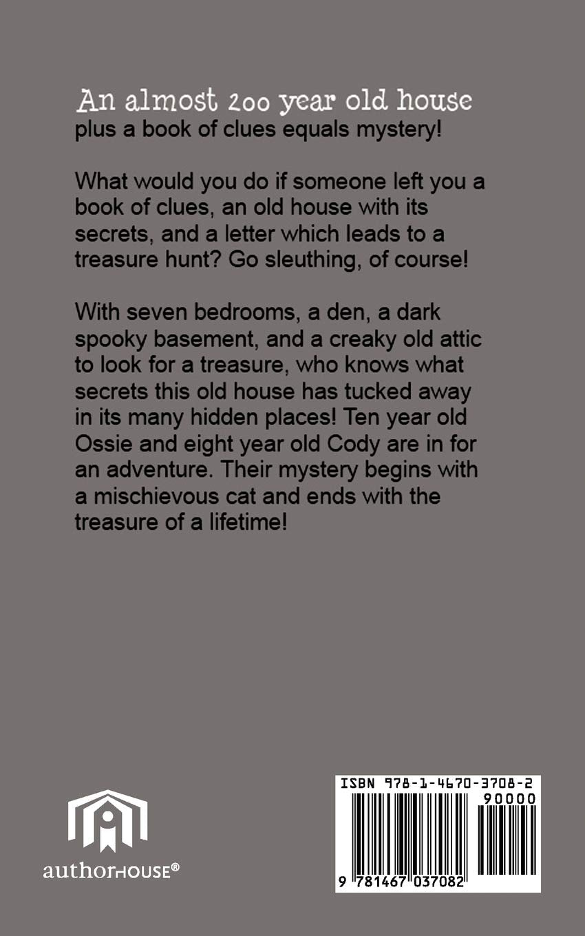 With seven bedrooms, a den, a dark spooky basement, and a creaky old attic to look for a treasure, who knows what secrets this old house has tucked away in its many hiding places! Ten year old Ossie and eight year old Cody are in for an adventure! Their mystery begins with a mischievous cat covered in flour and ends with the treasure of a lifetime!"
